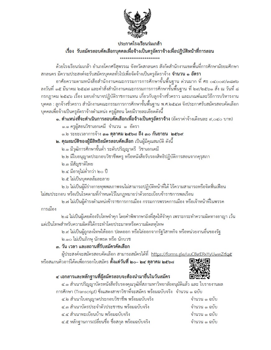 รับสมัครสอบคัดเลือกเพื่อจ้างเป็นครูอัตราจ้างชั่วคราวปฏิบัติหน้าที่ครูผู้สอน(เคมี) โรงเรียนร่มเกล้า สกลนคร